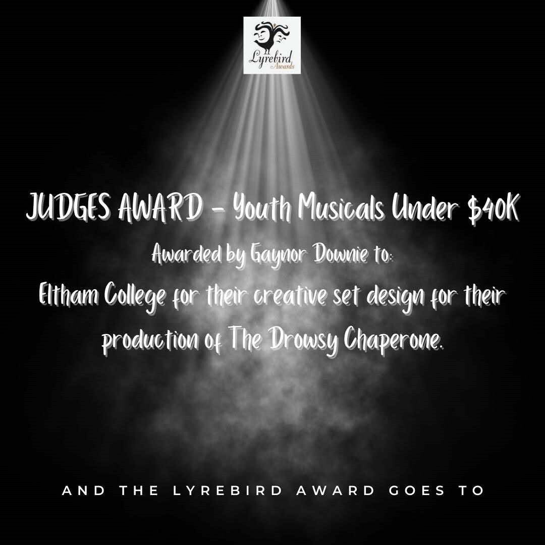 ELTHAM College was proudly represented on the night, with several outstanding achievements recognised across our productions. We are especially pleased to congratulate Caelan Robertson, who received two awards, and John Clayton, whose contribution was also formally acknowledged. We also celebrate the College being recognised with a Judges’ Award for creative excellence in set design.